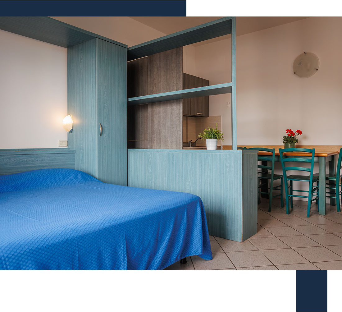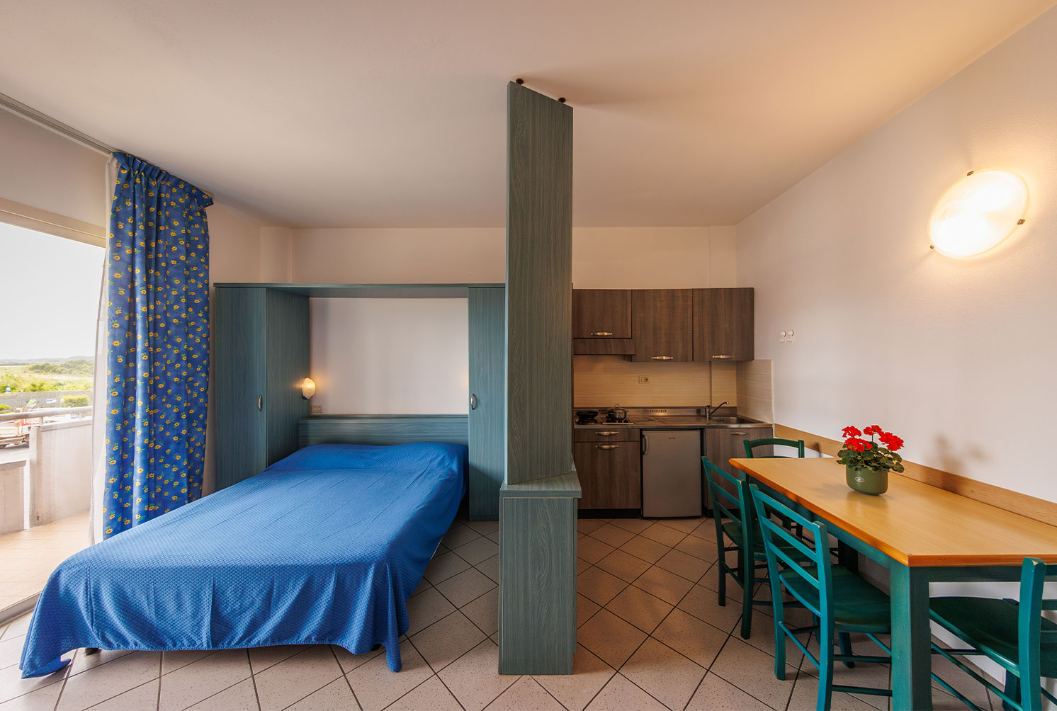 Ideal for families with two children. The two-room apartments of our residence are characterized by a bedroom separated from the living area and equipped with a double bed, a single bed and a sofa bed. Each apartment has a large 15 sqm terrace with chairs and table.